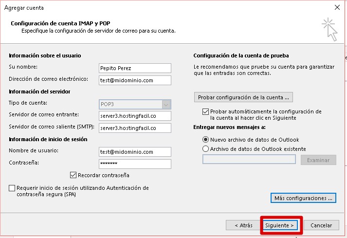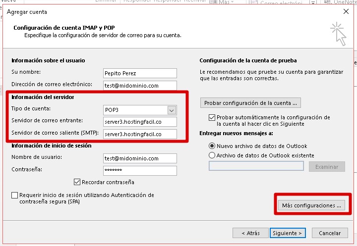 6. En la ventana a continuación digite los datos de configuración de su cuenta y de click en Más configuraciones...