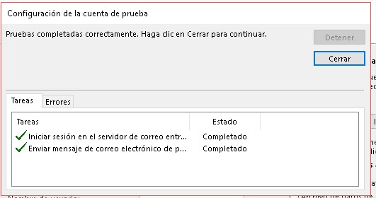 10. En pantalla deberá observar la siguiente ventana con las dos Tareas en estado Completado, si sale algo diferente verifique los datos de cuenta de correo y contraseña (puede hacerlo desde webmail) y repita todos los pasos de nuevo.
