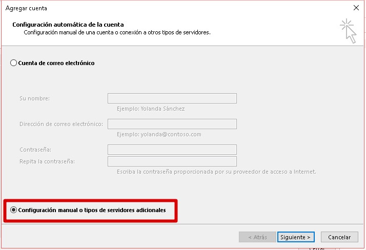 4. Elige la opción Configuración manual o tipos de servidores adicionales. y click en Siguiente