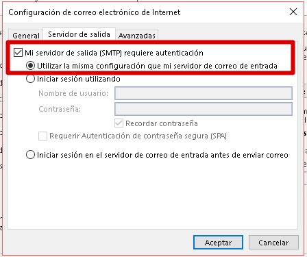 7. En la pestaña Servidor de Salida, seleccionar Mi servidor de salida (SMTP) requiere autenticación y Utilizar la misma configuración que mi servidor de correo de entrada