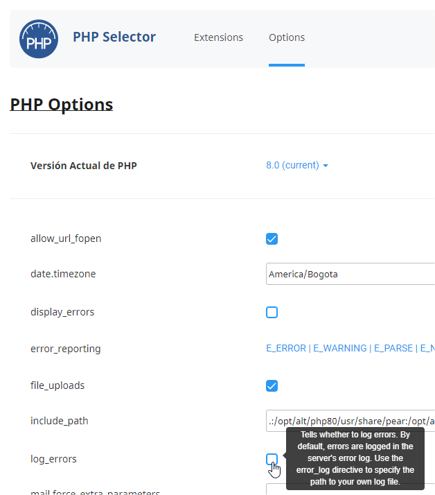 Para registrar temporalmente los errores en cPanel -> Seleccionar versión PHP -> Options