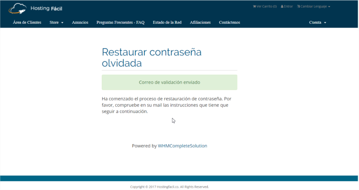 4. Revisa tu correo electrónico. Allí, te debe de haber llegado un mensaje con el asunto "Actualiza tu contraseña de HostingFacil.co". Dentro de él, haz clic sobre el enlace, el cual te enviará a la siguiente pantalla.