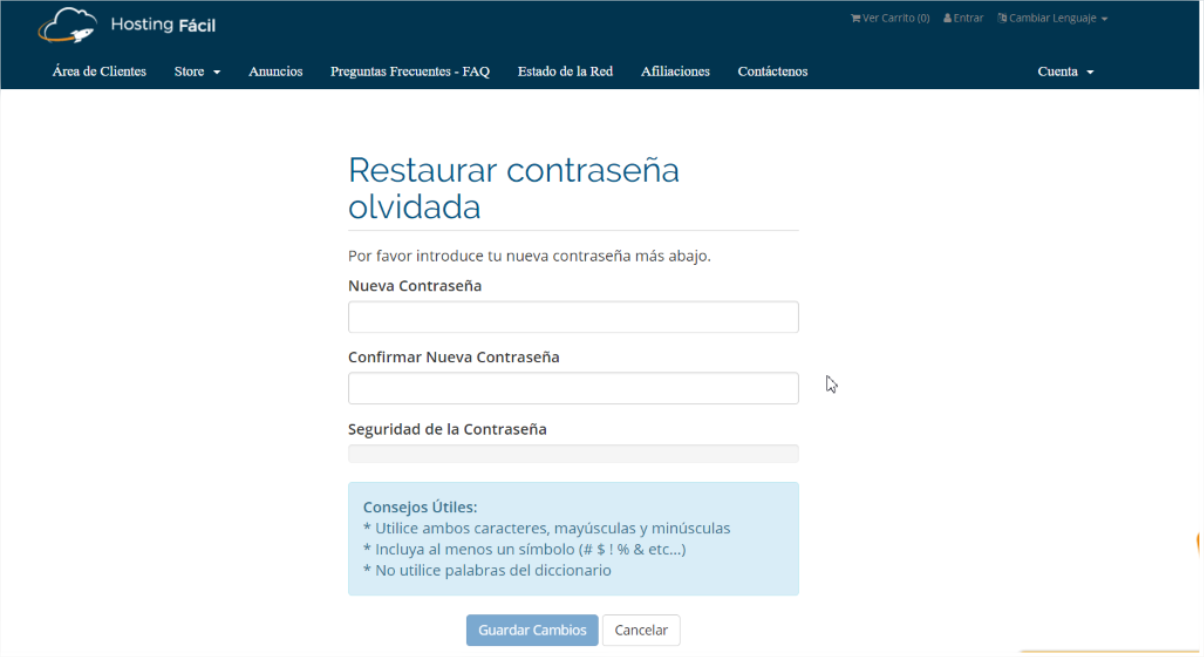 5. Ingresa la nueva contraseña teniendo en cuenta los consejos útiles para la creación de una contraseña más segura. Por último, haz clic en "Guardar Cambios". Te aparecerá una pantalla como esta.