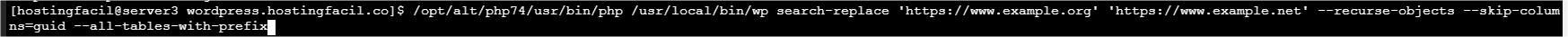 /opt/alt/php74/usr/bin/php /usr/local/bin/wp search-replace 'https://www.example.org' 'https://www.example.net' --recurse-objects --skip-columns=guid --all-tables-with-prefix