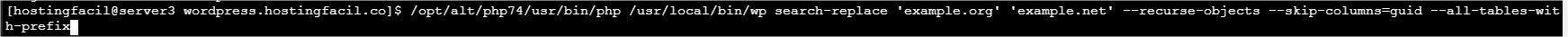 /opt/alt/php74/usr/bin/php /usr/local/bin/wp search-replace 'example.org' 'example.net' --recurse-objects --skip-columns=guid --all-tables-with-prefix