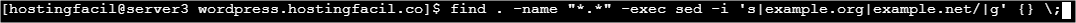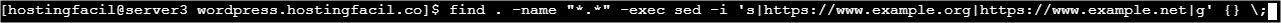 Ejecutas este comando:find . -name "*.*" -exec sed -i 's|https://www.example.org|https://www.example.net|g' {} \;