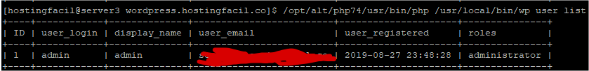 Este es el comando que debes ejecutar:/opt/alt/php74/usr/bin/php /usr/local/bin/wp user list