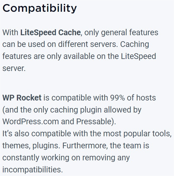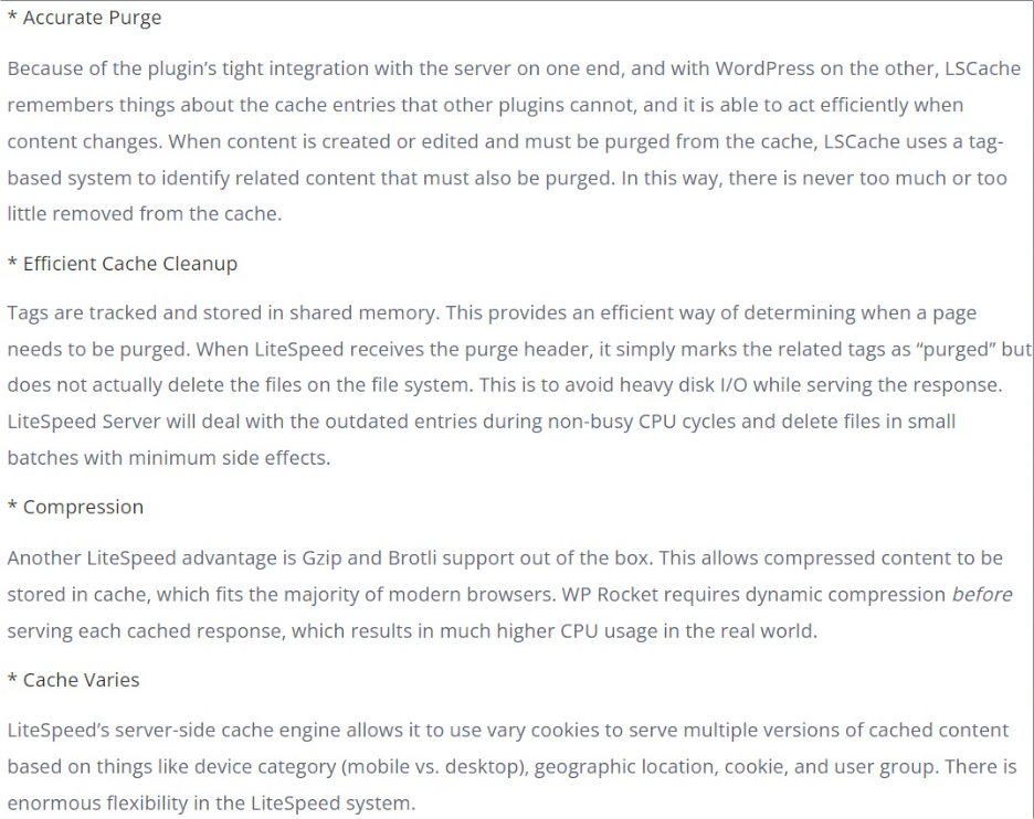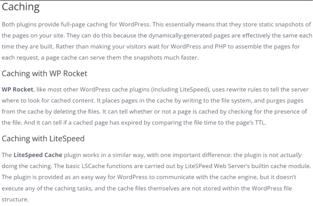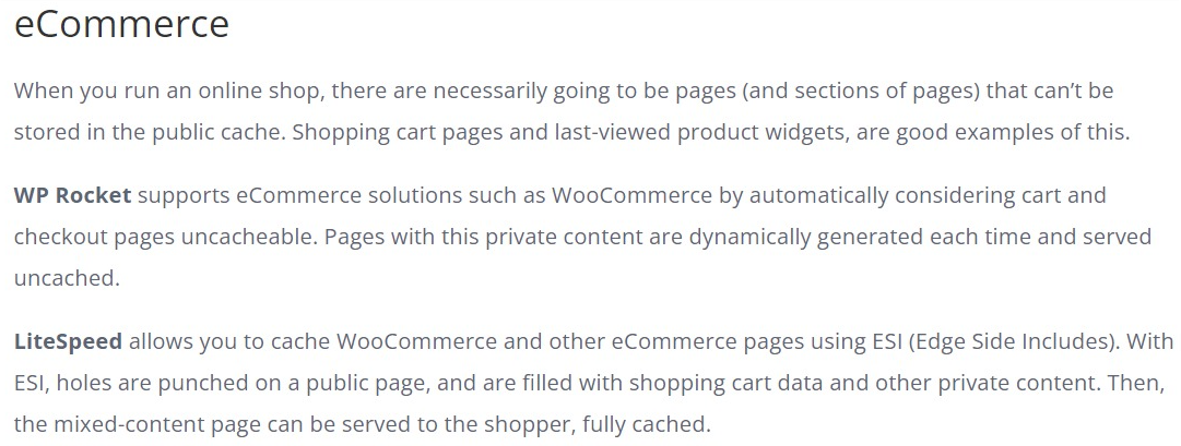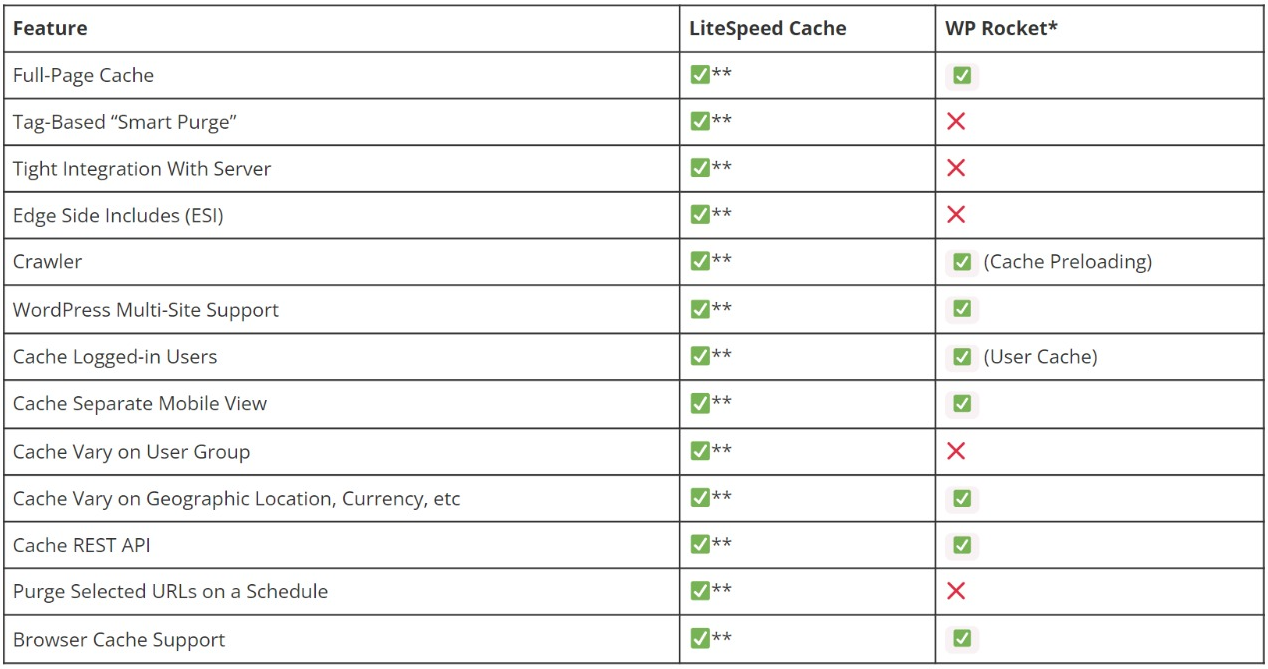 Todo lo tiene Litespeed, WP Rocket no tiene caché en el servidor (Lo hace lento al tener que ejecutar WordPress/PHP), no tiene caché de fragmentos que mejoran el Ecommerce/WooCommerce y otras características.
